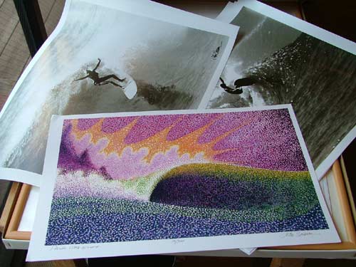 今回はプリントが3作。画像は点描の「PACIFIC WAVE」色使いがユニークで美しい作品です。その他に60年代のサーファーマガジンの表紙になった「SURF BE BOP」とブルーの色使いがきれいな「HOT LEFT」が届きました。