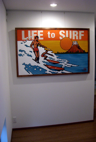 普段私たちは特に気にも留めずに富士山を眺めながら波に乗っていますが、それがいかに素晴らしいことなのか豊田さんの話しを聞いて改めて感じました。古いハワイの波乗りの絵をベースにしてなかなかクールな作品で気に入っています。