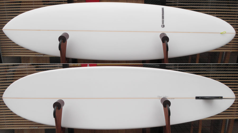 ボトムはスムースで抵抗が無いシェイプです。海に浮かべてパドルをしてみれば、そのスムースさがすぐに分かると思います。当然、滑り出しの感触も違います。ノーズコンケーブが抵抗になっているのがよーく分かると思います。
