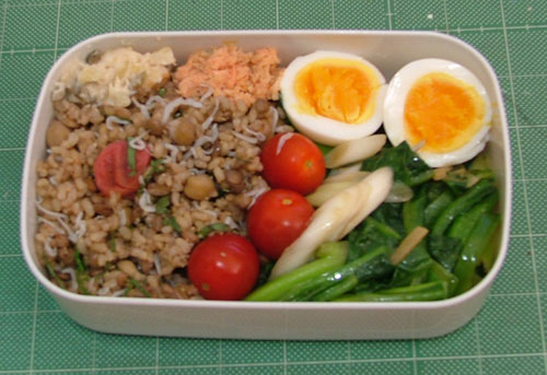 今日の昼食。ツルムラサキと長ネギ、ピーマンのしょうが風味炒め。ゆで卵に玄米ごはん(ヒヨコマメ、レンズマメ、アマランサス、大葉、チリメン入り)お中元でいただいた、鮭のほぐし身と数の子の粕漬け少々。おいしいです。