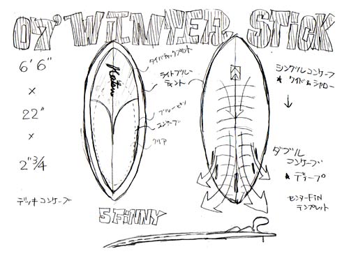 ダイアモンドテールに5フィン。70年代初頭のボンザーのプロトタイプのイメージと一昨日観た「MORNING OF THE EARTH」でMPが乗っていたエッグぽいシングルフィンのイメージ。ワイドテールになりそうなので短めにして5.11。幅広テールとテールのラインが直線的になりそうなので短い方が良いような気がします。ボトムシェイプも動かしやすいようにVEEにダブルコンケーブを浅めに入れると良さそうです。