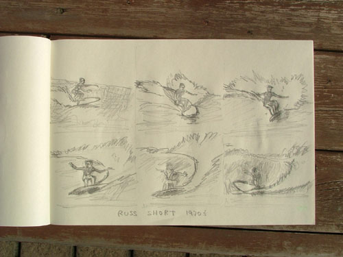 今日の一枚は70年代のボンザーライダー、RUSS SHORTのカットバックシークエンス。下の段は元の写真が不鮮明なのでうまく描けず…五枚目からはボードしか見えなくなってますがボンザーらしいシークエンスです。ジョエル・チューダーもRUSS SHORTのようにサーフィンしたいからボンザーに乗るんだと語っていたのを読んだことがあります。ボンザー5のホームページのムービー、かっこいいですもん。