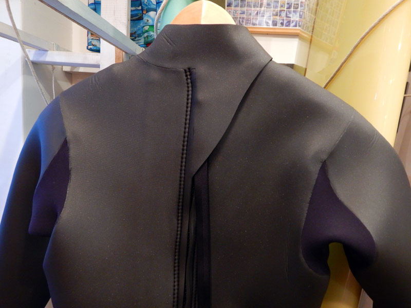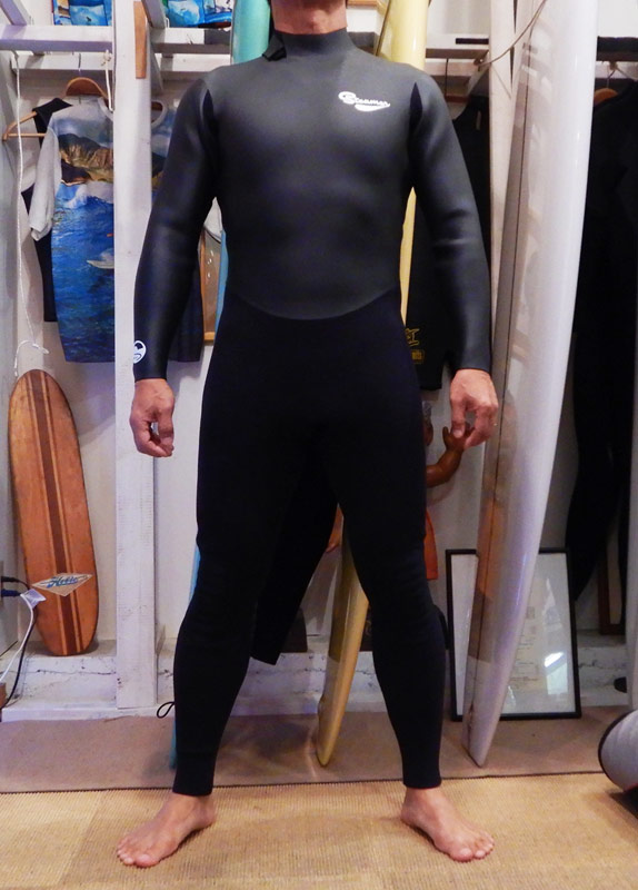 早速着てみましたが、撮影はちょっと失敗。後ろに他のウェットがぶら下がったままで、下半身が良く分からなくなっちゃいました(良く見えないくらいがちょうどいいか 笑)。