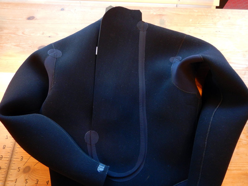 ジッパーの裏はセミドライと同じ作りにしてもらいました。インナーフラップ大きいです。これが背中からの浸水をシャットアウトしてくれます(セミドライは標準ですが、3フルは1.100円アップになります)。