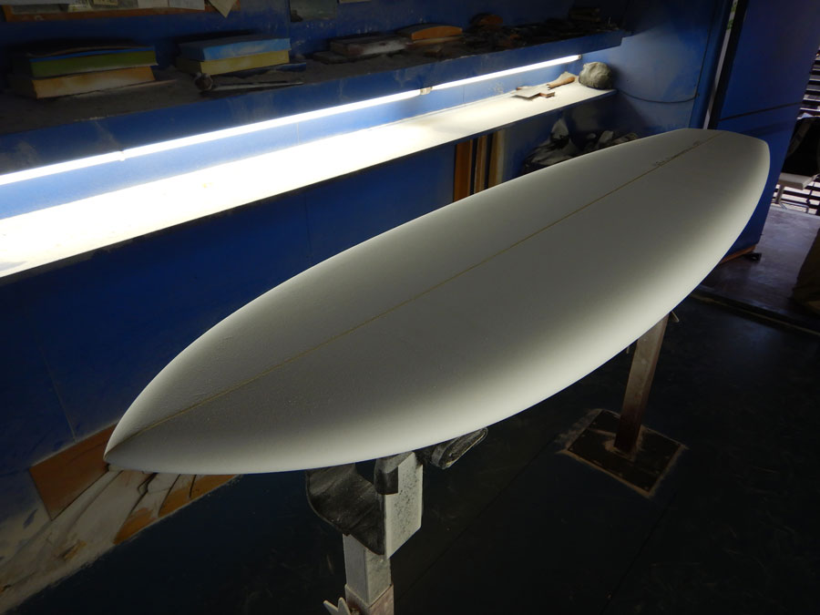 もう一本のシェイプは、オーダーボード。Tさんの3フィンボンザー 7’8”。