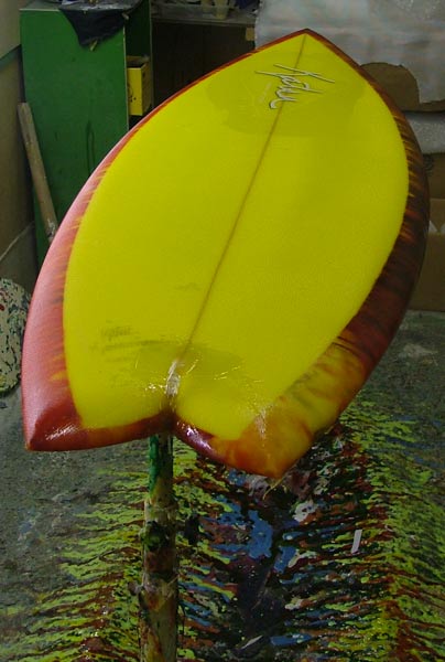 これは前回、アブストラクトでボトムをラミネートしていたロケットフィッシュ。ロケットフィッシュはクラシックなフィッシュより、ノーズとテールを絞り気味にしたシェイプです。デッキはイエローのティントになりました。