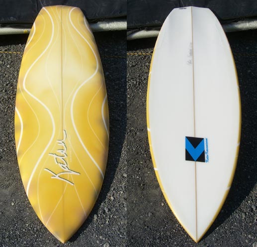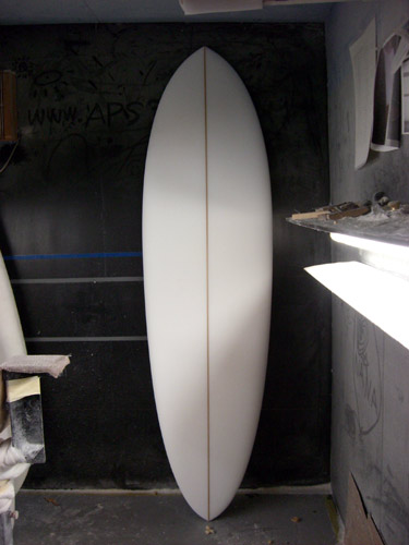 #1 6’くらい ミニ + ダイアモンドテール + 5フィン ワイデストポイントがずいぶん前方にある独特のアウトラインですがこれが調子良いようで何本も作っています。出来上がったら貸してください~。