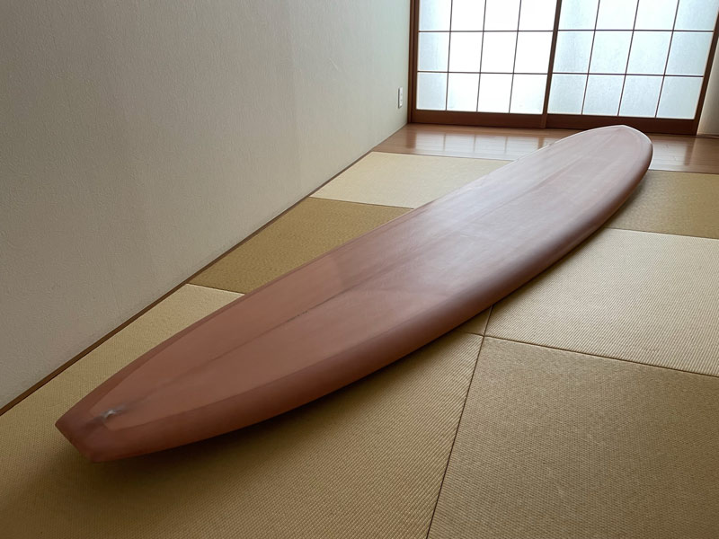 コンセプトはロングボードが70年代に続いていたら…です。60年代の終盤、ロングボードの時代が終わってボードはどんどん短くなっていった時代を活さんはリアルタイムで経験していますが、その後にやってきた素晴らしい時代、シングルフィンのショートボードの時代にもしロングボードを作っていたらこんな風になったんじゃない~?、というのがこのtotoのコンセプトです。