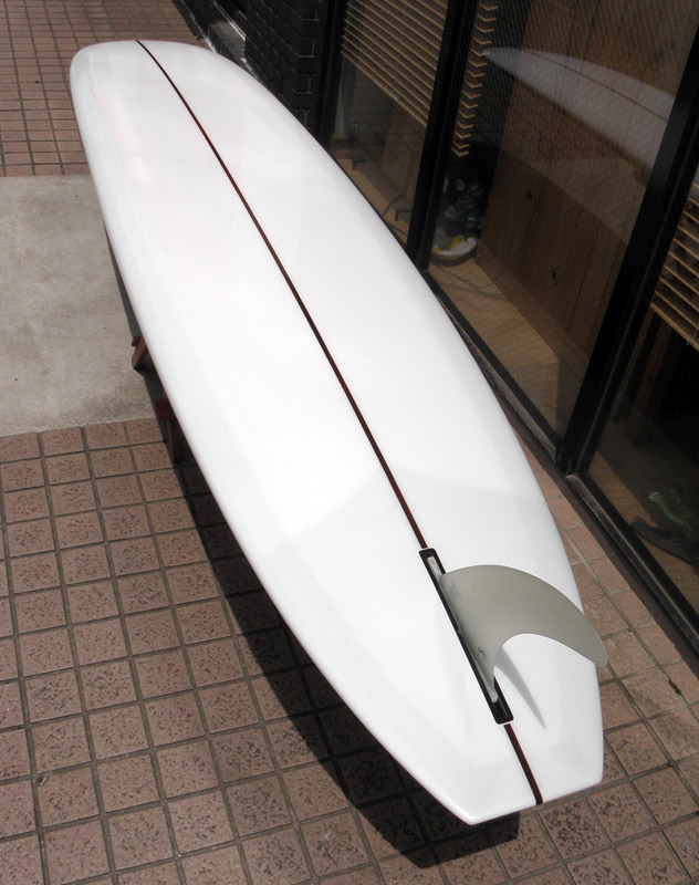 クラシックなログにこだわって、これまで乗り継いできたロングボードとはいろんな点で違いがあります。スクエアテールと呼ぶには少々細いかと考えてしまう絞り気味のテール、ダウンレールとフラットなボトム、テールエッジ、センターフィンの位置、そしてしっかり目に入ったロッカー。
