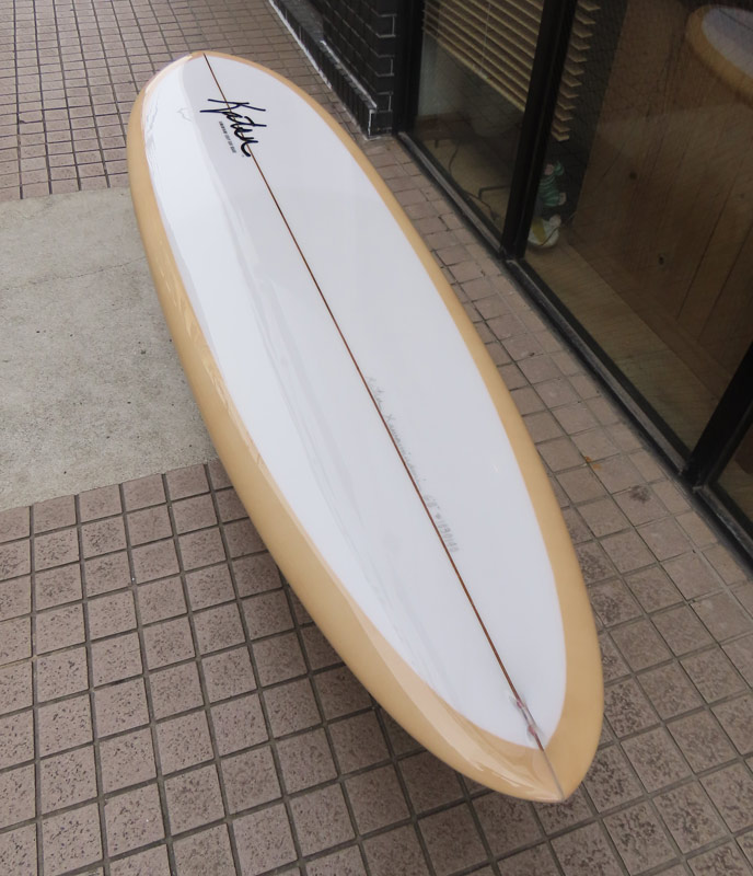 MINIモデルが入荷しました。ストックボードです。サイズは6’8”x22”x2”3/4。亜麻色のピグメントでラミネートして、クリアのデッキにはボランクロスでパッチを入れました。