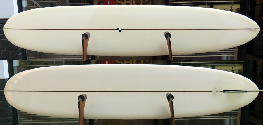 レングスは9’3”。ベースはクラシックログのB52ですが、ノーズライダータイプのB52とはロッカーを変えています。強くはありませんがボードのセンター付近から滑らかにテールまでロッカーが付けられています。ラウンドピンのテールとの組み合わせで、よりスムースに動いてくれます。