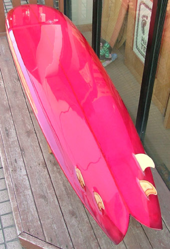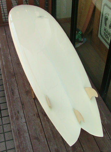 こっちはIさんのフィッシュシモン。101フィンのバンブートライを使いました。このフィン、まだ日本じゃめずらしいんじゃないかな?サンプルで入ってきていたのを無理言って使わせてもらいました。フォームはクラークだしIさんウルトララッキーですよ。こっちのボトムもKさんのクアッドと同じ深いコンケーブですが、トライフィンに合わせて違うテールロッカーです。