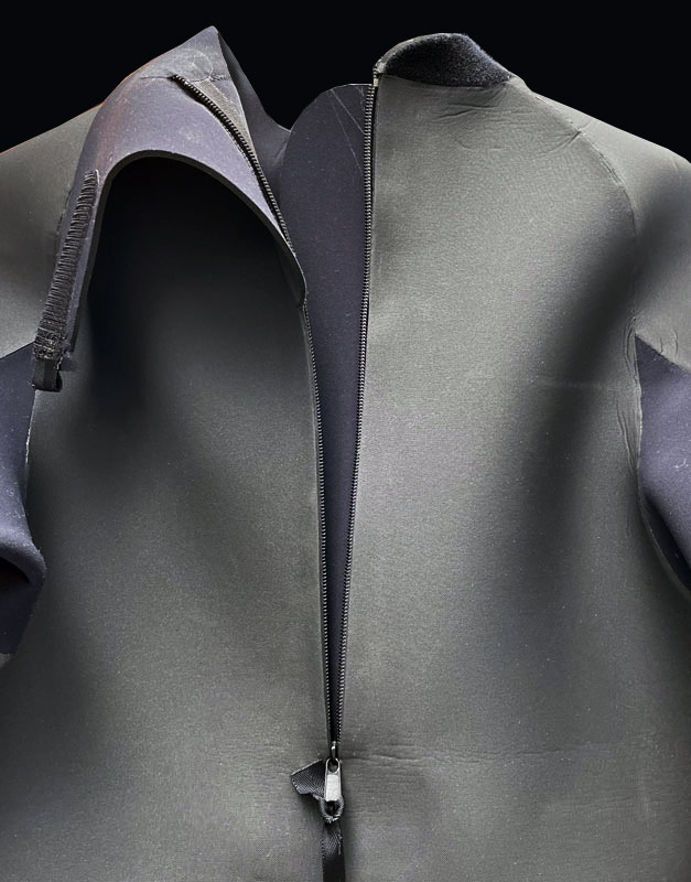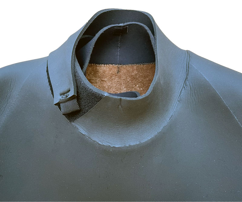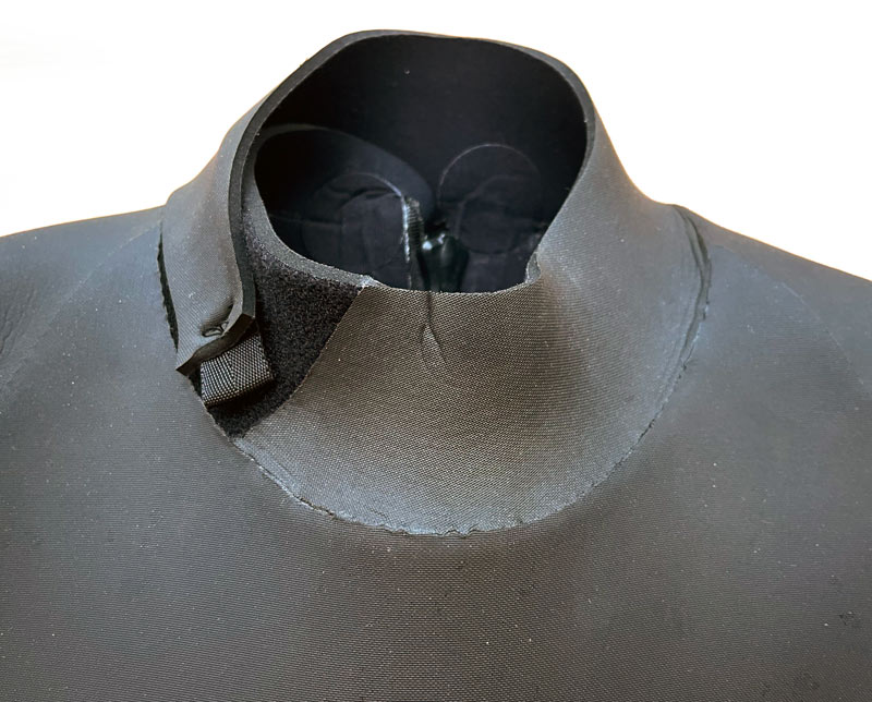 首回りです。首の後ろにパーツを必要最低限にして首へのストレスを減らしました。首の横のマジックテープで固定しますが、固定する位置を調整する事で首の後ろの密着度を自由に調節することができます。首の後ろに密着させると、ドルフィンでも水はほとんど入ってきません。