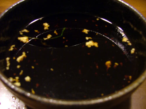 野菜はネギと白菜少々。カツオと醤油と味醂で作ったタレに取っていただきます。薬味は細く切った焼き海苔。