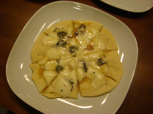 モツアレラチーズとゴルゴンゾーラチーズのピザ。メイプルシロップをかけて食べます。ほんの一例