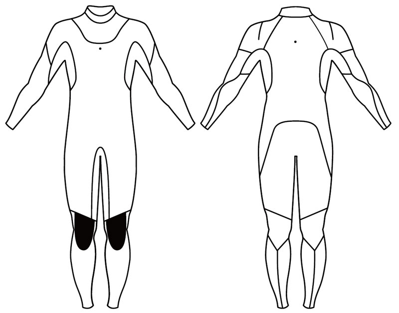 お分かりいただけますか?前身ごろはひざ上から、肩、背中にかけて一枚のパーツで構成されています。U字型のジッパーのレイアウトは、腕と肩へのストレスを最小限にした、U-ZIPライトと同じですが、今まで外側に出ていたネック部分のパーツをウェットの内側に配置することで、ヒザから肩にかけて一枚の生地でのカットになっています。