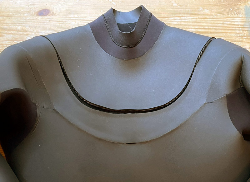真冬の過酷な気候条件下で使われるセミドライスーツでは、防水性と保温性という絶対的に必要な条件を確保した上で、最も動き易いベストな位置にジッパーと胸部のジッパーユニットの縫製ラインがレイアウトされています。