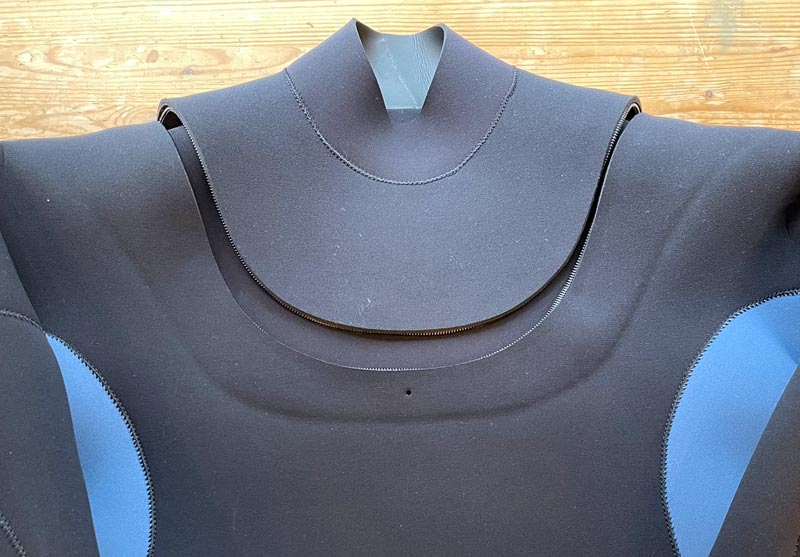 水温が比較的高い季節に使用するジャージのスーツでは、保温の面で必要とされるレベルが下がってくる分、動きやさを強調することが可能になります。それがこのジッパーのレイアウトの形状と、前身ごろの一枚の生地という形になっています。