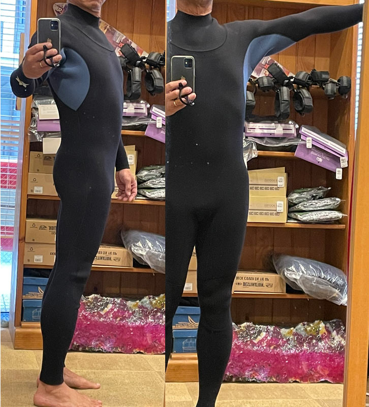 こんな画像ですいません。実際に着てみると軽さと動きやすさがよーく分かります。胸回りと肩回りは少し余裕がある作りで、袖は腕を上げたときの型紙になっているので、パドルの動きは本当に軽いです。