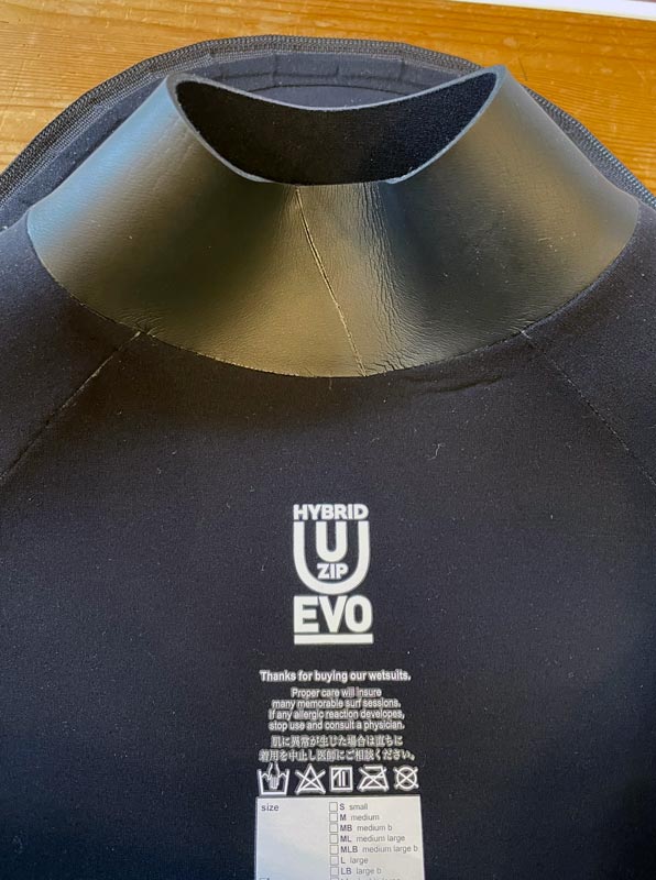 裏地には「EVO」の文字がプリントされています。首回りは防水性を考えて裏地にラバーを使っています。上のセミドライスーツも同様の仕様ですが、実際に防水性はほぼ完ぺきで真冬でも冷たい水が入ってくることはありませんでした。(サイズが合っていないとダメですよ)