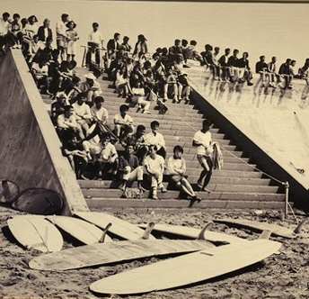 活さんが送ってくれたこの写真。68年、69年のどちらかと言っていたと思いますが、七里ガ浜での大会の写真です。今と同じ階段の下には、VEEボトムの姿も見えます。ネットも何も無い時代ですが、さすが湘南のサーファーたちは新しいものに敏感です。