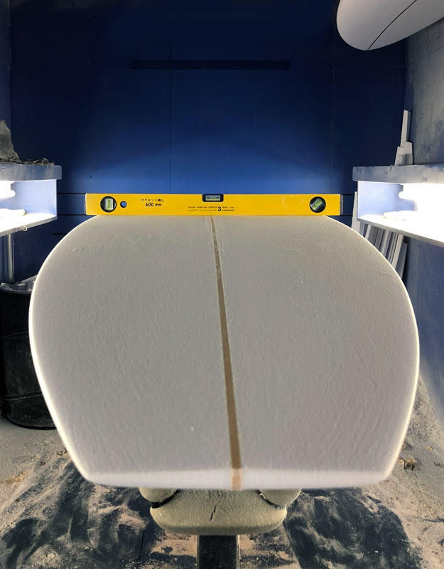 なかなか無いシェイプだと思います。9’2”の同じシェイプがかなり面白いので、同じシェイプでミッドレングスサイズにしてみたのです。なので、サーフボードの性能としては問題無いと思いますが、全体の雰囲気が想像できません。カラー、ロゴマーク、ラミネート、仕上げをどうするかがいまいち定められません。