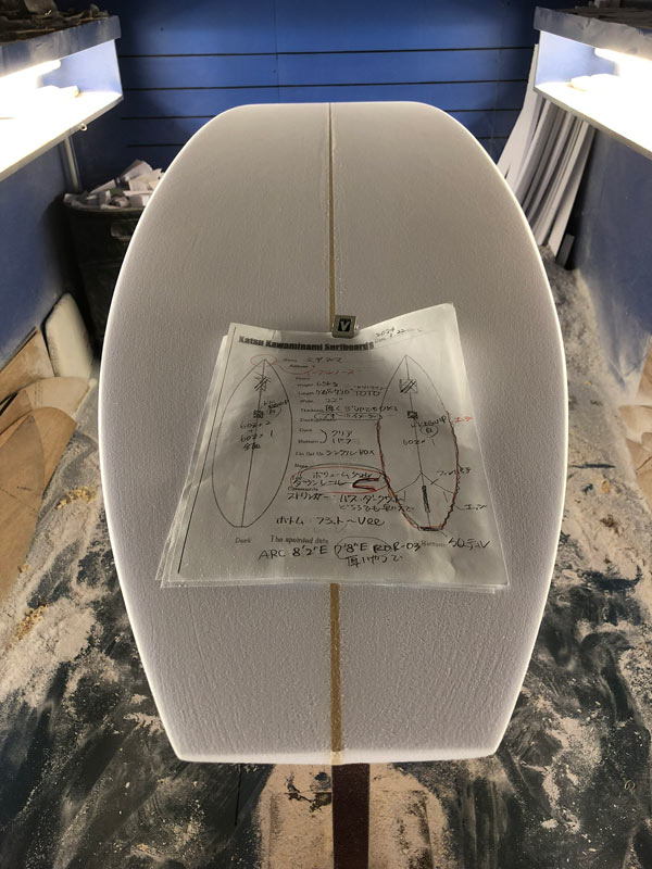 TOTOのミッドレングスサイズのシェイプが出来上がったようです。ダウンレールとフラットデッキ。イーグルノーズにしてもらったノーズがいい雰囲気です。