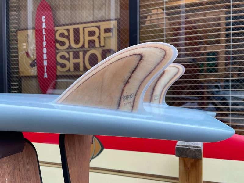 サイドフィンはあくまでも「きっかけ」と「支え」の存在だと考えて、トライフィンのような三つのフィンの関係性をくずして、サイドフィンとセンターフィンを近づけられるようにしました。センターフィンがハルのように前方寄りなので、テールが流れそうなターンのときにレールをキープしてバランスをとってくれることを期待しています。(ちょっとだけ遊びも入れてみました)