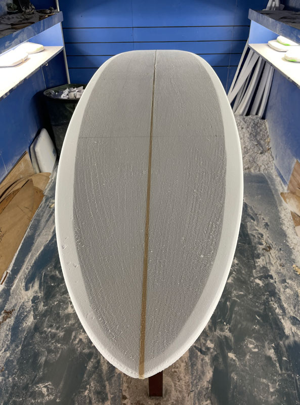 プロジェクトXは、昨日の時点でこの状況です。細かいところを調整中です。先週のブログで8’8”と書きましたが、測ってみたら8’9”と1/2インチでした。ノーズからテールまで余すところなく使っった、フルブランクスレングスです。