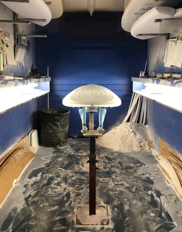 両側のラックには、シェイプが出来上がったボード、削りかけのボード、次のシェイプに使うブランクスが乗っています。奥の壁には水平をみるためのラインが何本か引いてあるのが見えます。ここで写真を撮るときには、ストリンガーと奥の壁にあるセンターを示す目印を合わせて撮影するクセがいつのまにか付いてしまいました。