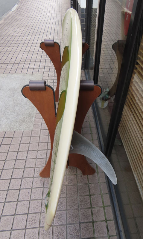 実はこのボード作ったばかりです。ボードのオーナーさんは、北海道から東北、千葉と本州を南下しながらこのボンザーに乗って、ボンザーフィンにも慣れていい感じになってきたそうです。でも突然、アタマの中がシングルフィンに乗りたい!になってしまって、それが頭から離れなくなってしまったようで、調子いいんですけど次をお願いします!と置いていかれました。(その他にもこの方のお仕事の季節とのタイミング的な理由もあるんですが)