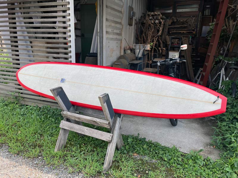 ロングボードモデルのTOTOを借りてきました。レングスは9’3”です。私が作ってもらった同じ9’3”のTOTOと比べると、少しだけレールが薄い手触りです。
