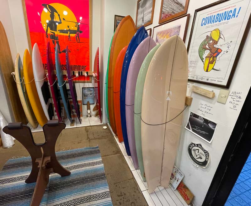 ディスプレイというより放置ですが、小さなショップのあちこちにサーフィンのメモラビリアが隠れています。ボードの隙間から探してみてください。