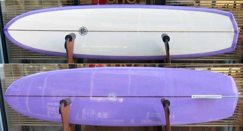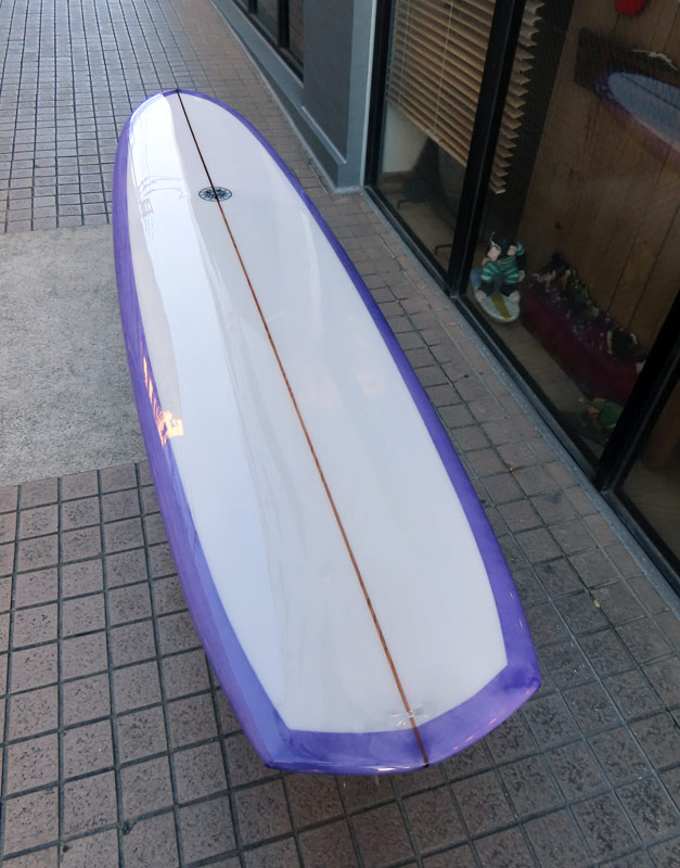 AC SHAPE Vee bottom 出来上がりました。レングスは7’6”。オーダーでお作りしました。ダークウッドストリンガーに淡い紫のティントカラー、デッキにボランクロスでパッチを入れています。