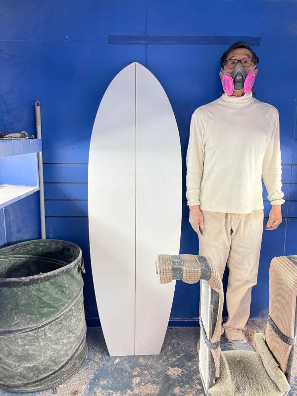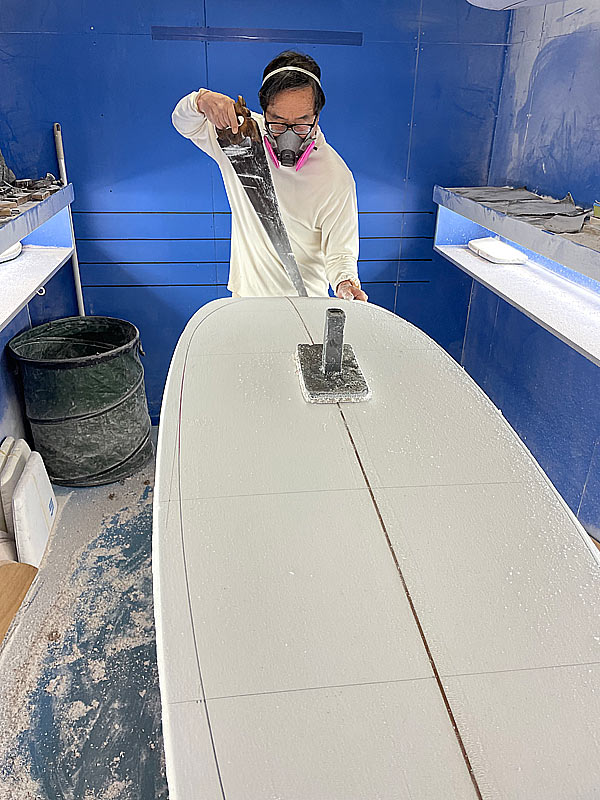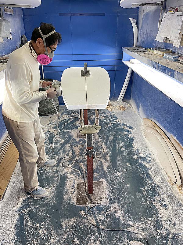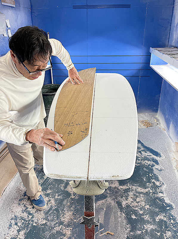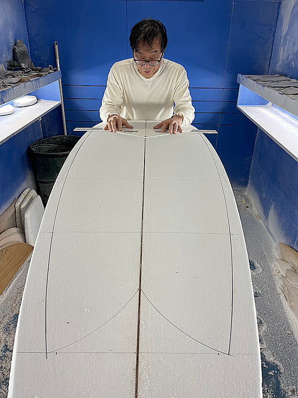 それぞれの特性を表現するポイントもデザインによって変わってきます。シェイパーは数多くのデザインをアタマの中に入れておく必要があります。50年以上にわたってシェイプに取り組んでいる活さん(改めて書くと、50年ってスゴイ)ですが、シェイプするボードがどれもほぼ同じ形で同じサイズばかりだった時代もあったそうです。