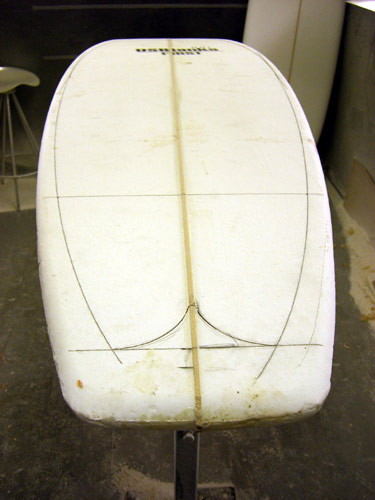 今日は朝からリペアボードのピックアップへ。タイミングよくカツさんと会えたので新しい5フィンのアウトラインを引いてもらいました。