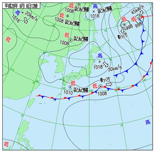 たとえばある日のこんな天気図。日本の南岸に前線が停滞しており、そこを低気圧が西から東へと進んでいます。