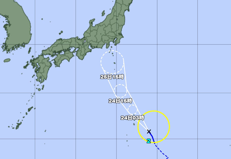 台風2号ができました。画像は気象庁の進路予想です。米軍とWINDYもおよそこんな感じです。この後は関東東海沖で進路を東に変えて、太平洋沿岸をかすめるように北東へ抜けていくようです。