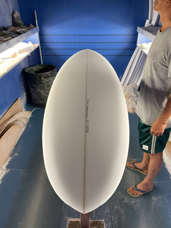 ボトムは深いチャネルで、フィンはツインです。ちょっと前に同じサイズで作ったチャネルツインが、先週の台風波でかなり調子良かったらしく、それと同じシェイプです。