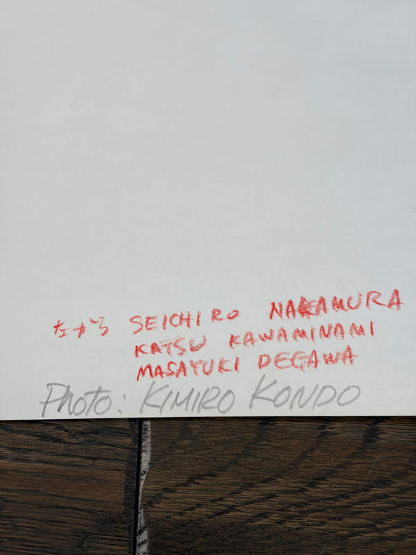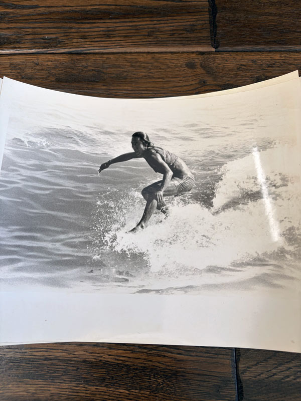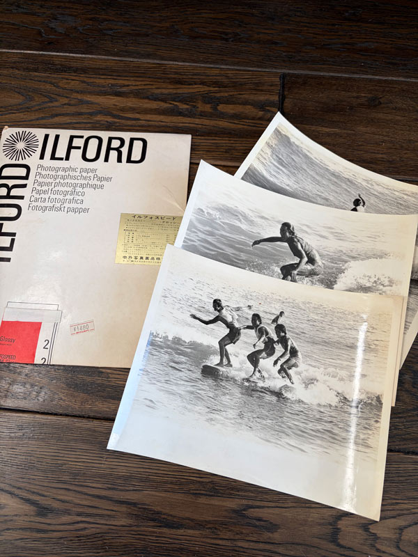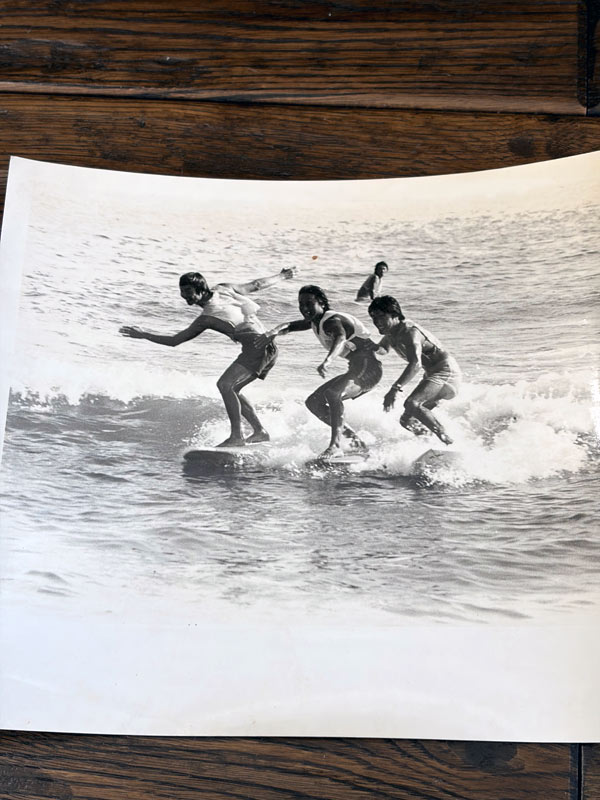 大会のジャージを着て、なぜか並んで波を滑っている三人のサーファー。真ん中が、川南活さんです。リーシュはまだ無い時代。場所は私が今も波乗りしているポイントです。六つ切りサイズの印画紙にプリントされた、1970年ごろの写真です。印画紙なんて久しぶりに聞く言葉じゃないかと思います。覚えてましたか?