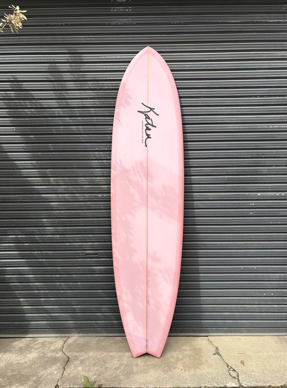 昨日のチャネルツインに続いて、ツインフィンをもう一本。レングスは7’6”、スワローテールのツインフィン。活さんのサマーボードです。