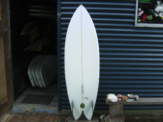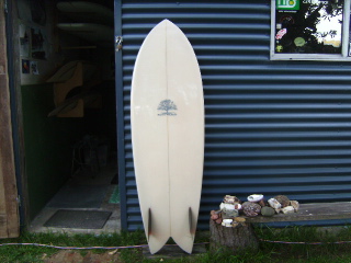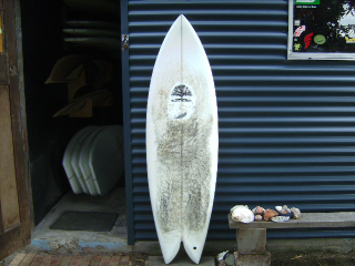 以前にメネフネの店でも扱っていたGLASS LOVEに登場するフィッシュと同じモデル。SIDE CUT FISHと呼んでいます。もともとスノーボードからインスピレーションを得たシェイプで、フレックステールとベースが長い大きな片面フォイルのフィンがドライブを生み出すフィッシュです。以前のものと若干アウトラインが変わってきているか?