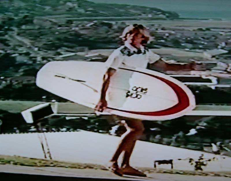 DVDを見ていたらこんなのを発見。オーストラリアのピーター・クロフォード。ステップボトムに長いフレックスフィンが付いたニーボードを抱えヒッチハイクをしているの図。