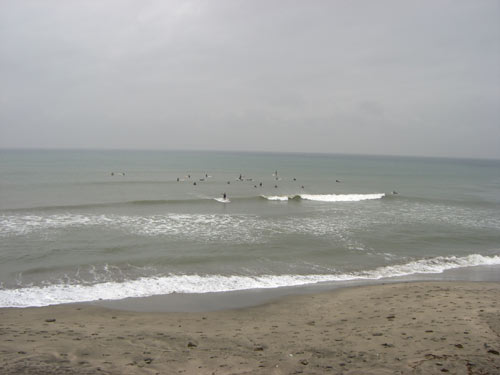アウトに出たとたんちょうど来たセット。「どーぞー」と声がかかったので遠慮なくレフトへテイクオフ。よろよろと立ち上がったらそこはボトム(笑)。件(くだん)の体勢を意識しつつボードに立つと、掘れ気味のフェイスに戻ってレールが入って走りはじめます。カットバックを二回入れてインサイドでプルアウト。なんだか今日こそはこのボード、乗れそうな気配。