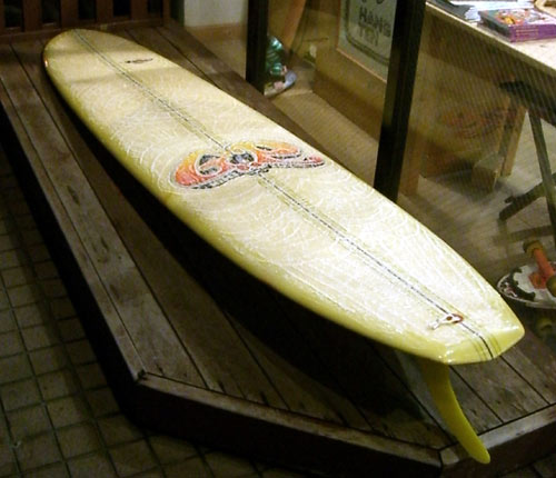 サーフボードの系譜は60年代において、このVEEボトムとダウンレーラーの二つに枝分かれして進化していきます。VEEボトムは進化の過程で淘汰されてしまうデザインなのですが、ふと思いついたひとつの可能性があります。それは「ディスプレイスメント ハル」の先祖はこのVEEボトムじゃないか?ということ。丸いコンベックスボトムとピンチレールにフレックスフィン、テールエリアのフラットボトムが進化の証拠…なんて根拠が無い勝手な想像ですが、なんだかそんな楽しいことを考えさせてくれた気持ち良いグライドがVEEボトムでした。
