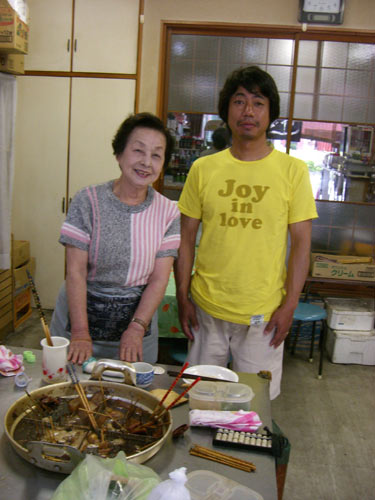 三代目というおばあちゃんが具材をいろいろ教えてくれます。店の中は私たち二人だけだったせいか、おばあちゃんも私たちのテーブルに座っていろいろとお話をしてくれました。