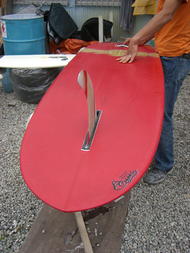 立ち上がっても意外といけますこのボード。同じようなアウトラインで5フィンも調子いいから当たり前か。バックフィンが少々大きすぎたようで、動きがいまいち鈍いのですがダウンザラインやブレイクが速いセクションを横に滑るのは、チョー気持ちよいボードです。この気持ち良さを残してもっと軽く動けるようにするにはどーするかがこれからの課題であります。