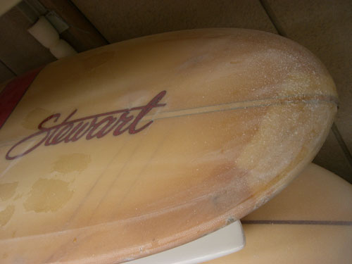 リペアショップには、いろんなボードが。STEWARTのハイドロハルはもうトラディショナルか?