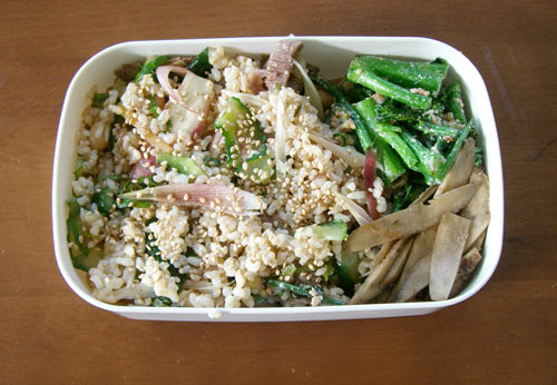昨夜のバーベキューの残りの牛肉をショウガ風味で焼いて、玄米酢飯にミョウガ、庭のキュウリを混ぜ込みました。