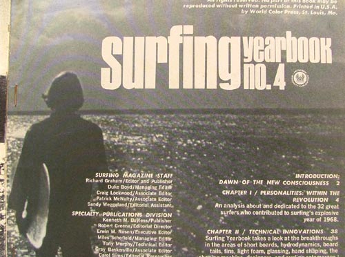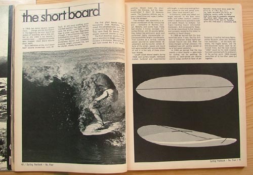 つまりHULLやVEEボトムというサーフボードは現在のサーフボードのルーツになっているということなのです。フィッシュやボンザーもひっくるめてトランジションボードという呼び方をしていますが、正確に言うならフィッシュやボンザーは「トランジション期」のボードということになると思います。当時、時代を引っ張っていたサーファーたちはそのほとんどがHULLやVEEボトムのデザインに乗り、新しいマニューバに挑戦しさらにボードを発展させていったのです。そういう見方をするとHULLやVEEボトムこそがリアル・トランジションボードと呼べる存在なのかもしれません。歴史の流れの中でロングボードから現在のサーフボードへと繋がっている系譜上にあるボードデザインはHULLだということを判らせてくれたのがこの1968年のSURFING YEAR BOOKでした。